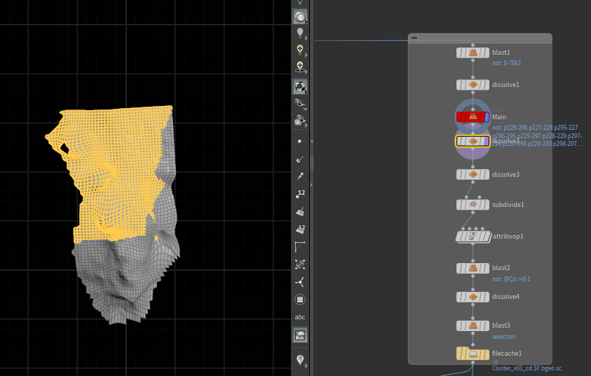 모델링은 후디니에서 HeightFiled 노드로 큰 틀을 만들고, Soft transform으로 손으로 당겨서 디테일 부분은 맞췄다.