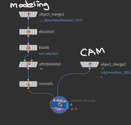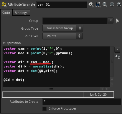 1) 필요한 정보 : 카메라 pivot 점의 위치값 (@P) , 모델링 각 포인트들의 포지션 위치값 (@P) , 모델링의 normal 값.