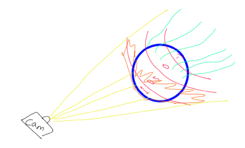 카메라와 운석을 dot product 한다.