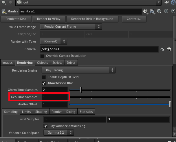 - Mantra > Geo Time Samples : 기본수치 1 사용한다. (setting에 영향받지 않아서, 사용하지 않는다.)