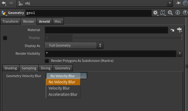 Geometry> Render> Sampling> 모션블러 셋팅 3가지 선택 1. No velocity Blur No velocity Blur : object의 velocity로 계산할때, topology에 변화가 없을때 사용한다. (일반 transform으로 생긴 blur) Mantra > Geo Time Samples : 최소 2 이상이여야 한다. 앞,뒤 프레임을 계산해서 Blur 가 생기는 구조여서, 최소 2를 넣어줘야 1-2 가 계산되서 생긴다. 2. Velocity Blur Velocity Blur : 시뮬레이션 등, topology가 변할때, Fx작업으로만 끝나는 작업일때 사용한다. Mantra > Geo Time Samples : 기본수치 1 사용한다. (setting에 영향받지 않아서, 사..